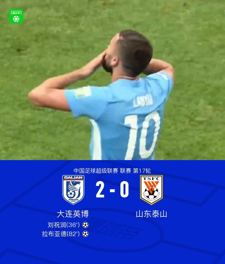 7月19日,中国足球超级联赛第17轮,大连英博坐镇主场迎战山东泰山。上半场,卡扎伊什维利停球低射中柱,马马杜身体不适离场,刘祝润过掉防守兜射远角破门;下半场,拉布亚德任意球直接破门。最终,大连英博以2比0战胜山东泰山,全取三分。