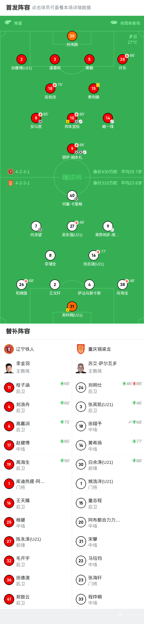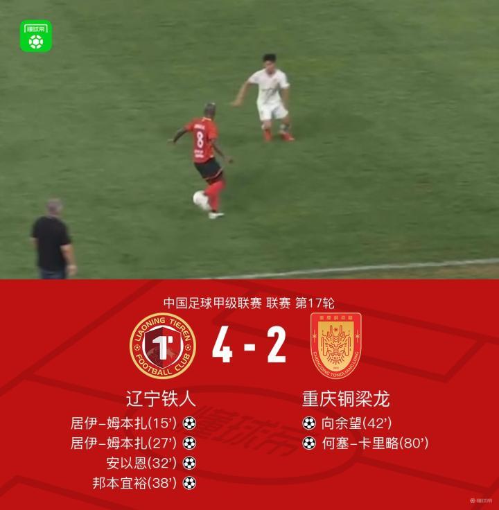 北京时间7月19日中国足球甲级联赛 联赛 第17轮,辽宁铁人主场对阵重庆铜梁龙。辽宁铁人居伊-姆本扎梅开二度,安以恩、邦本宜裕破门。重庆铜梁龙向余望、何塞-卡里略破门。最终比分辽宁铁人 4-2 战胜重庆铜梁龙。