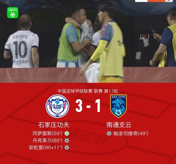 7月19日,中国足球甲级联赛第17轮,石家庄功夫坐镇主场迎战南通支云。比赛中,南通支云由帕洛切维奇接应陈彬彬助攻先拔头筹。随后,石家庄功夫由冈萨雷斯主罚点球命中,将比分扳平。比赛尾声阶段,徐俊驰送出助攻,丹克莱尔反超比分。补时阶段,安屹斐再下一城,为球队锁定胜局。最终,石家庄功夫以3比1战胜南通支云。