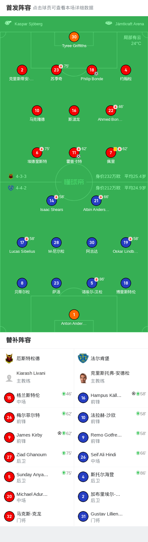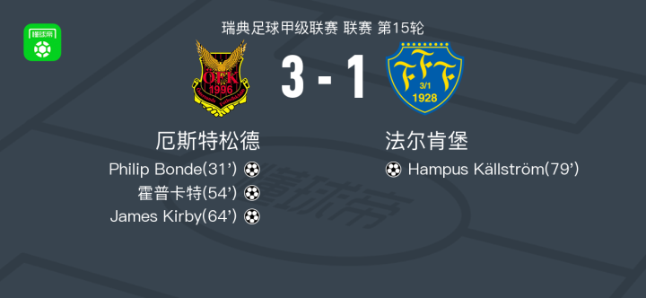 厄斯特松德3-1法尔肯堡,James Kirby建功,霍普卡特破门