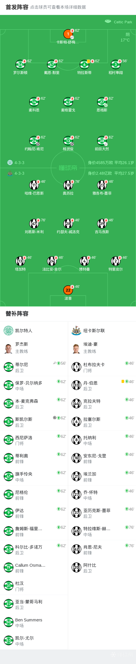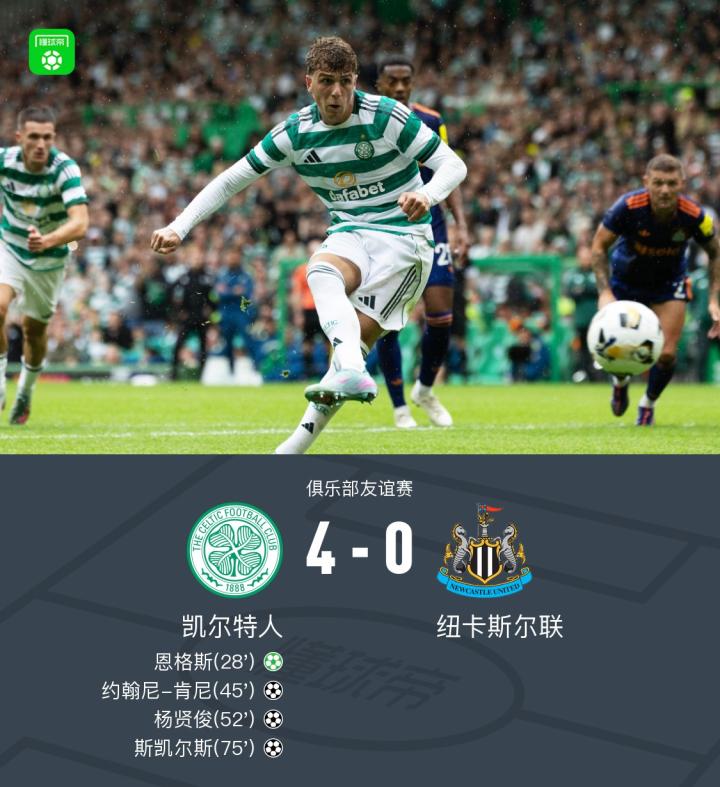凯尔特人4-0大胜纽卡,前田大然献助攻,杨贤俊破门