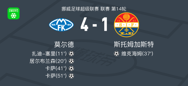 北京时间7月19日挪威足球超级联赛 联赛 第14轮,莫尔德主场对阵斯托姆加斯特。莫尔德扎迪-塞里破门,居尔布兰森破门,卡萨梅开二度。斯托姆加斯特维克海姆破门。最终比分莫尔德 4-1 斯托姆加斯特。