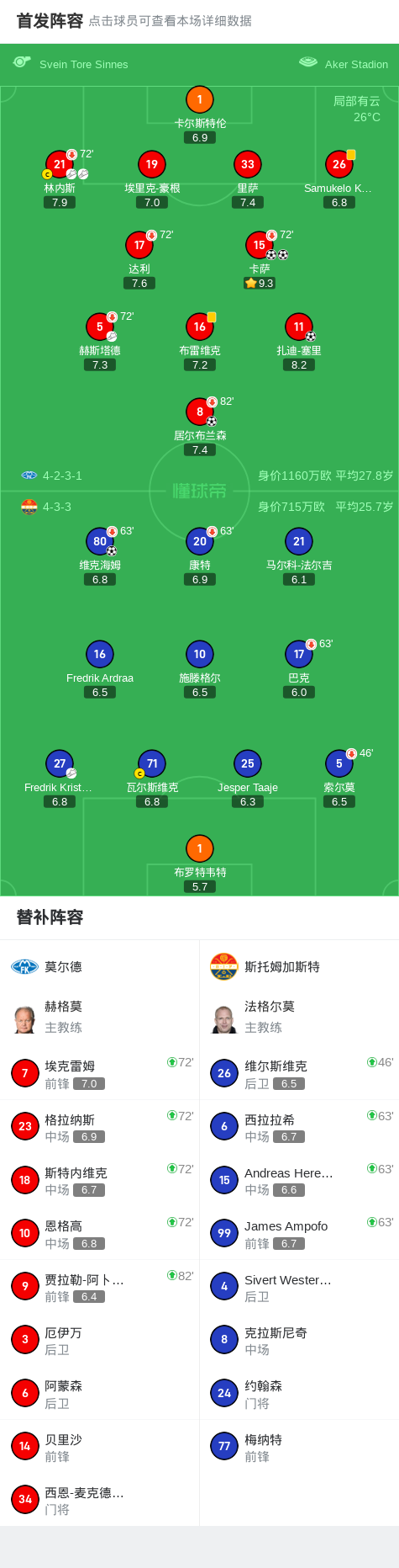 莫尔德4-1大胜斯托姆加斯特,卡萨双响,居尔布兰森破门