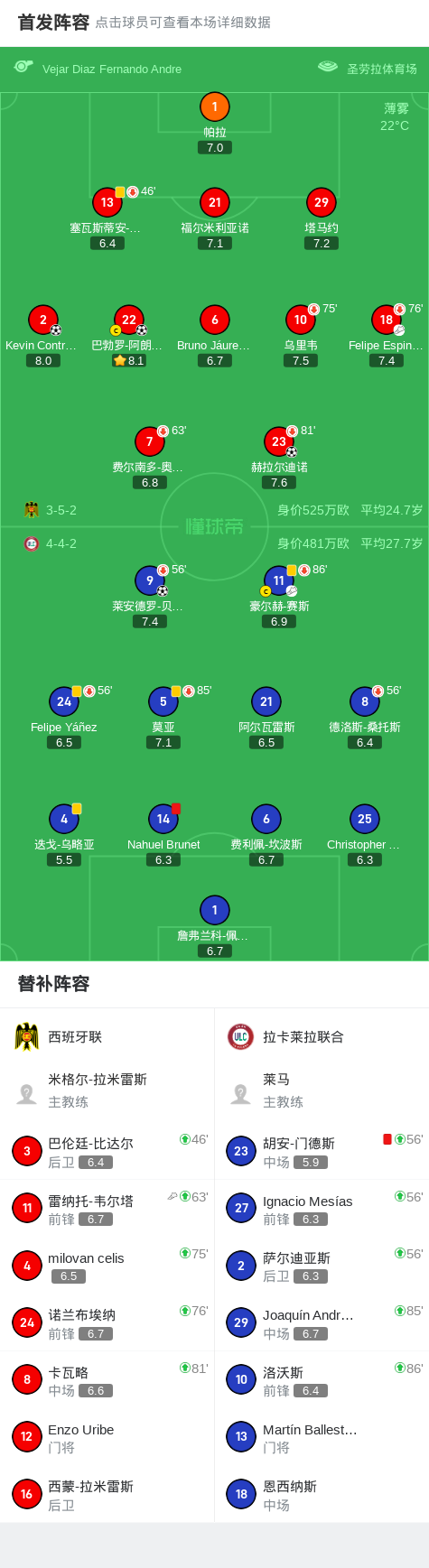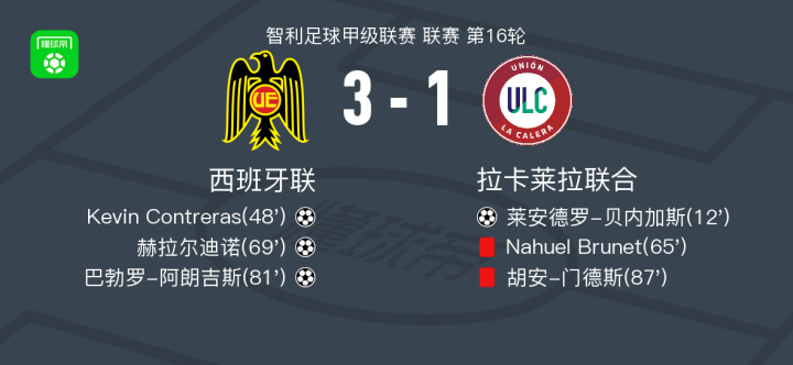 北京时间7月20日智利足球甲级联赛第16轮,西班牙联主场迎战拉卡莱拉联合。比赛第12分钟,拉卡莱拉联合球员豪尔赫-赛斯助攻莱安德罗-贝内加斯率先破门。第48分钟,西班牙联球员Felipe Espinoza送出助攻,Kevin Contreras扳平比分。第65分钟,拉卡莱拉联合球员Nahuel Brunet被红牌罚下。第69分钟,赫拉尔迪诺破门帮助西班牙联反超比分。第81分钟,雷纳托-韦尔塔助攻巴勃罗-阿朗吉斯扩大比分优势。第87分钟,拉卡莱拉联合球员胡安-门德斯两黄变一红离场。最终,西班牙联以3-1战胜拉卡莱拉联合。