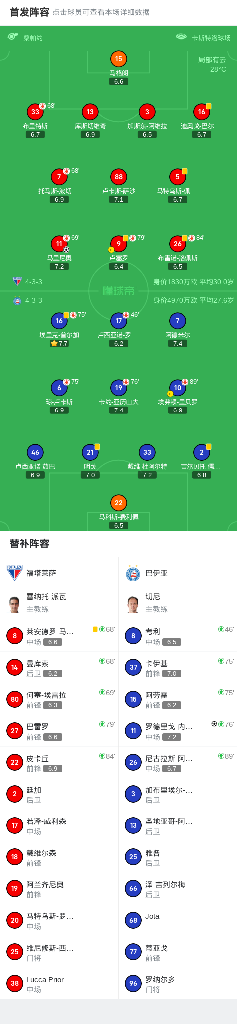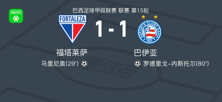 福塔莱萨1-1巴伊亚,马里尼奥首开记录,罗德里戈-内斯托尔扳平