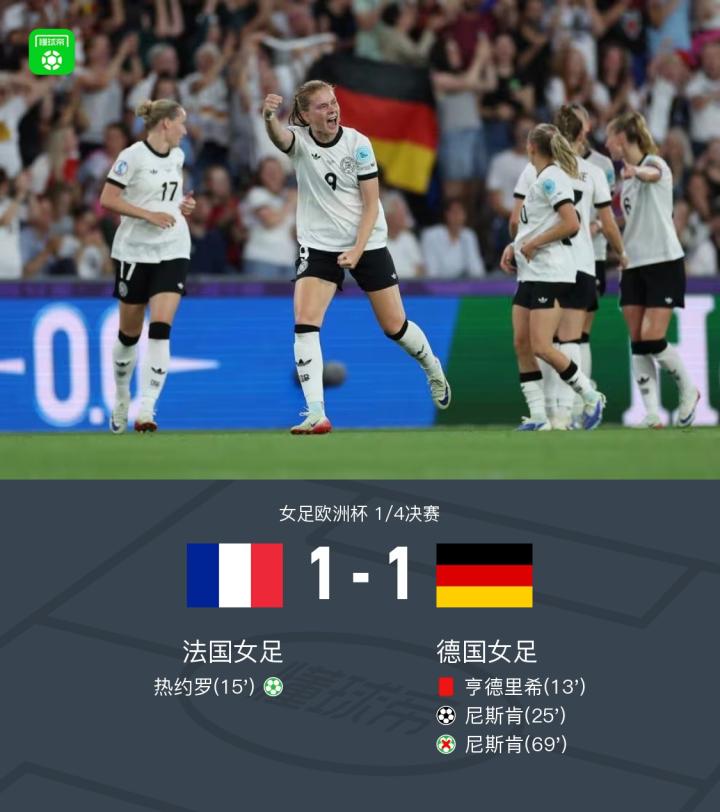女足欧洲杯1/4决赛,法国女足与德国女足展开激烈对决。比赛第13分钟,德国女足球员亨德里希因犯规被红牌罚下,为比赛早早带来变数。第15分钟,法国女足球员热约罗冷静主罚点球命中,帮助球队取得领先。第25分钟,德国女足通过精妙配合由克拉拉-比尔送出助攻,尼斯肯推射破门扳平比分。比赛第69分钟,尼斯肯再次站上点球点,但此次射门遗憾偏出,未能帮助球队逆转局势。最终双方以1-1握手言和。
