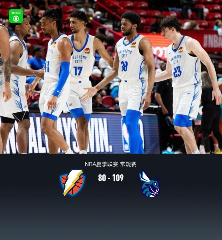 北京时间7月20日NBA夏季联赛 常规赛,俄克拉荷马雷霆对阵夏洛特黄蜂。半场雷霆33-52黄蜂,最终雷霆80-109黄蜂。