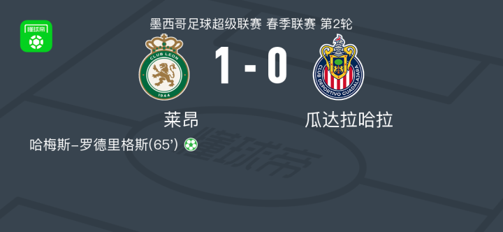 北京时间7月20日,墨西哥足球超级联赛春季联赛第2轮,莱昂坐镇主场迎战瓜达拉哈拉。比赛中,莱昂球员哈梅斯-罗德里格斯成功罚入点球,为球队打入全场唯一进球。最终,莱昂以1-0战胜瓜达拉哈拉,全取三分。