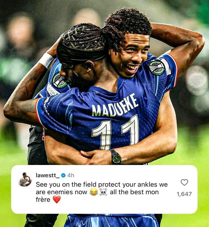 在马杜埃凯的社交媒体下,许多球员也向他表达了祝福,比如法国国脚韦斯利-福法纳:他的前队友开玩笑说,以后在比赛中对阵时需要保护好自己的脚踝。