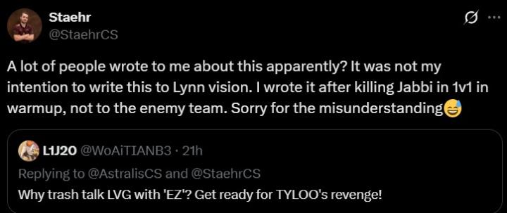 此外,关于Staehr与CNCS的小矛盾已经解开,他表示在对阵LVG图二热身时,打出的“ez”实际上是发给队友jabbi的。