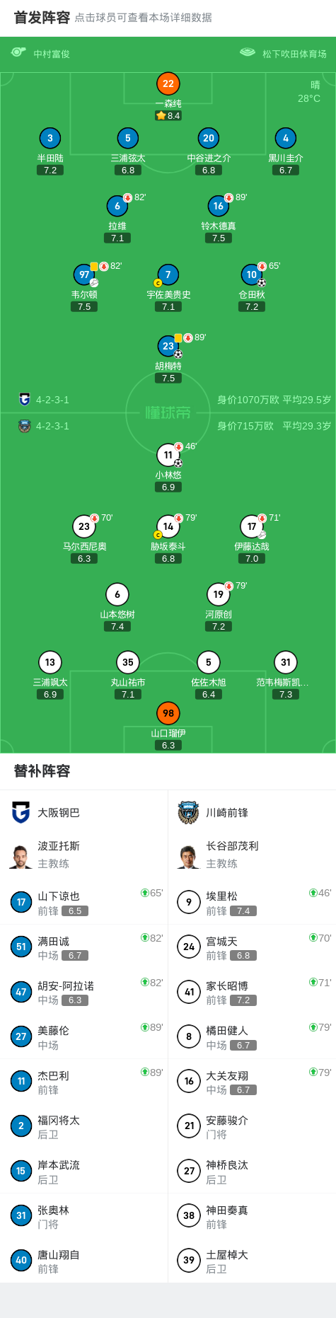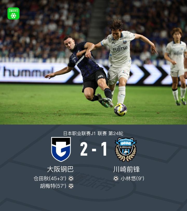 大阪钢巴2-1川崎前锋,仓田秋、胡梅特破门