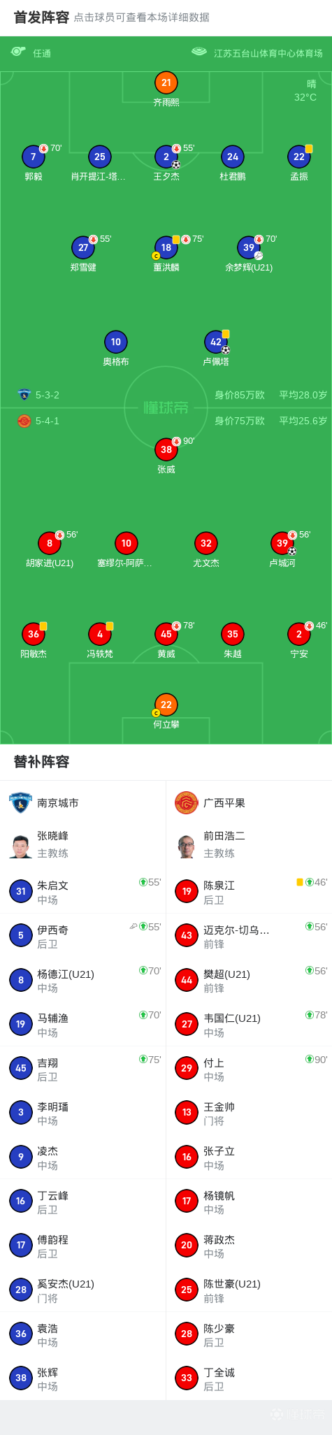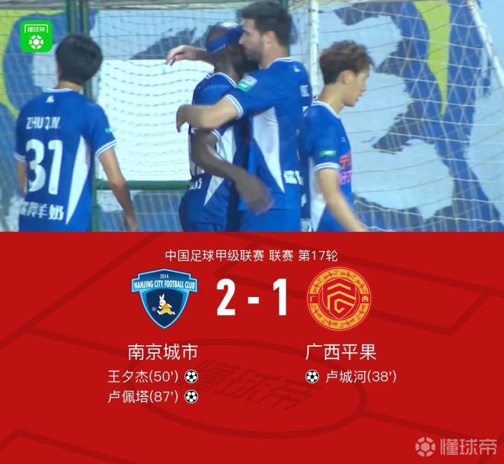 北京时间7月20日19:30,中甲联赛第17轮,南京城市主场迎战广西平果。上半场,齐雨熙超巨失误,卢城河笑纳大礼完成破门;下半场,王夕杰低射扳平比分,卢佩塔凌空破门完成反超。最终,南京城市主场2-1逆转战胜广西平果。