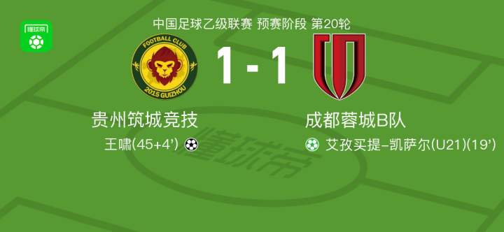 7月20日,中国足球乙级联赛预赛阶段第20轮,贵州筑城竞技坐镇主场迎战成都蓉城B队。比赛中,成都蓉城B队球员艾孜买提-凯萨尔罚入点球,为球队取得领先。上半场补时阶段,贵州筑城竞技由李习楠助攻王啸打入一球,帮助球队扳平比分。最终双方以1比1握手言和。