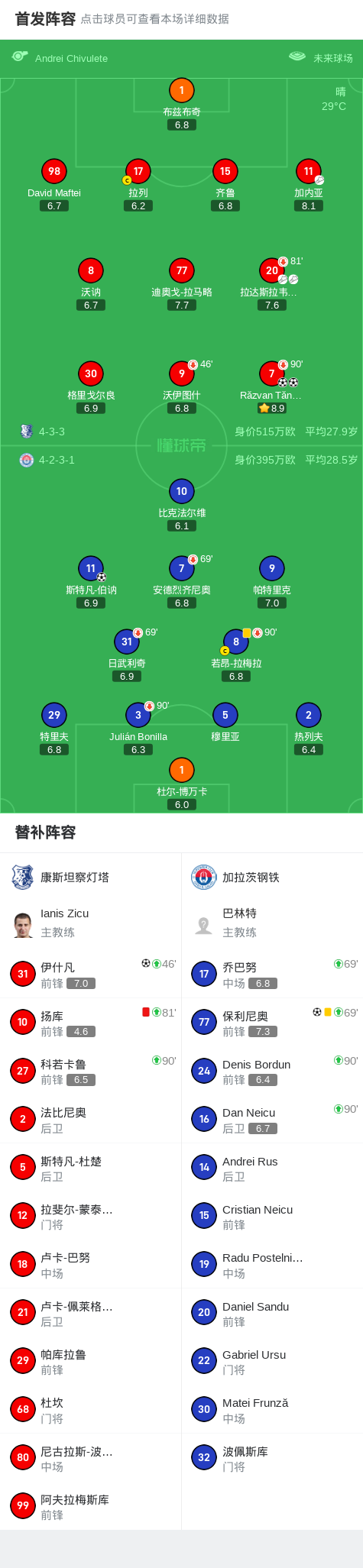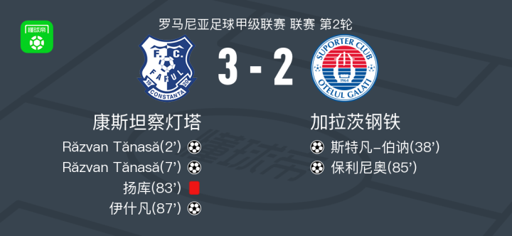 北京时间7月20日罗马尼亚足球甲级联赛 联赛 第2轮,康斯坦察灯塔主场对阵加拉茨钢铁。康斯坦察灯塔Răzvan Tănasă梅开二度,伊什凡破门。加拉茨钢铁斯特凡-伯讷破门,保利尼奥破门。最终比分康斯坦察灯塔 3-2 加拉茨钢铁。