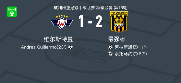 北京时间7月21日玻利维亚足球甲级联赛 秋季联赛 第15轮,维尔斯特曼主场对阵最强者。维尔斯特曼Andres Guillermo破门。最强者阿拉斯凯塔破门,索托马约尔破门。最终比分维尔斯特曼 1-2 最强者。