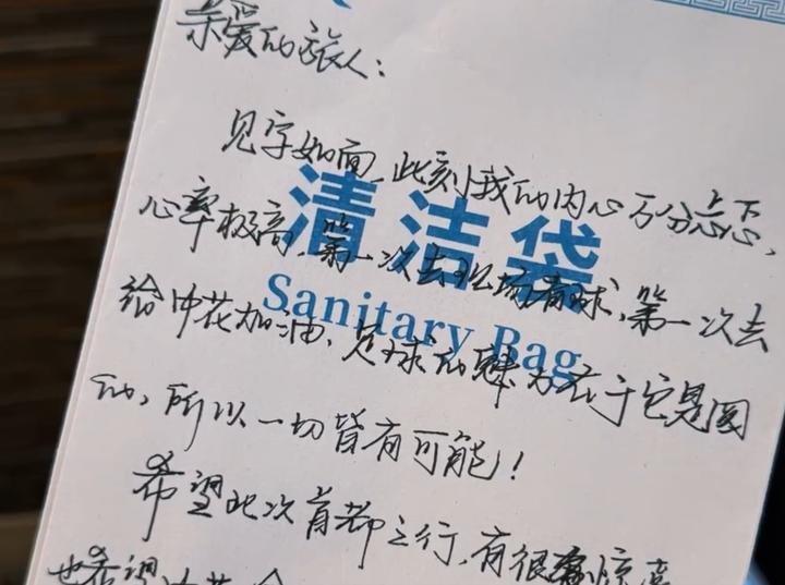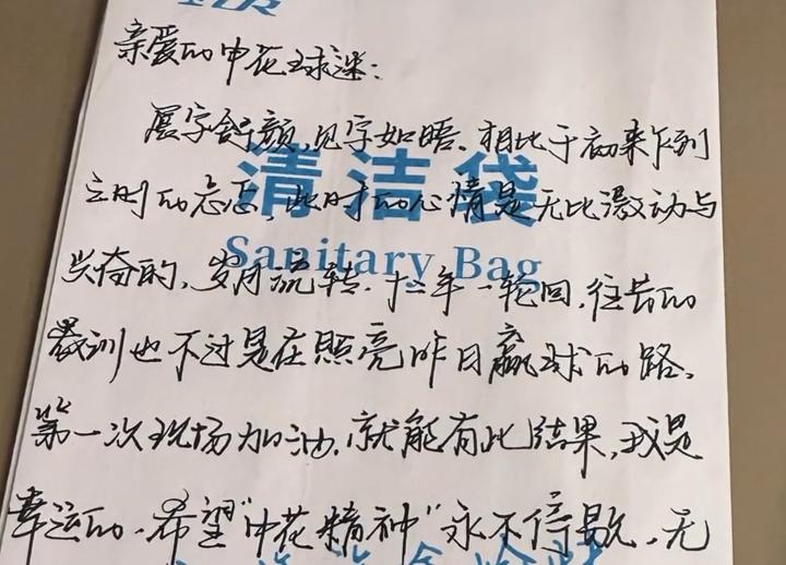 2025华润饮料中超联赛第17轮,上海申花3-1客胜北京国安,在今日申花官方发布的本轮比赛Match Day比赛日纪实中,记录了申花球迷Mia用高铁清洁袋写给申花球迷的寄语。