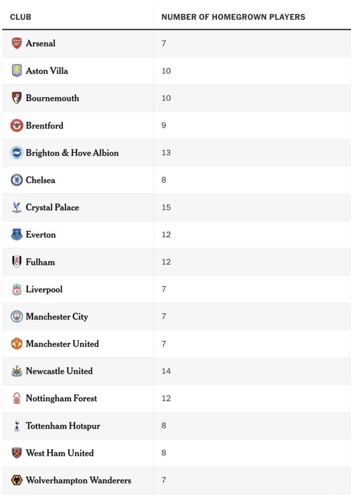 在2024/25赛季中,阿森纳、利物浦、曼城、曼联和狼队是本土培养球员最少的几支球队,每队只有7名。而水晶宫以15名本土球员领跑,纽卡斯尔联紧随其后,有14人。