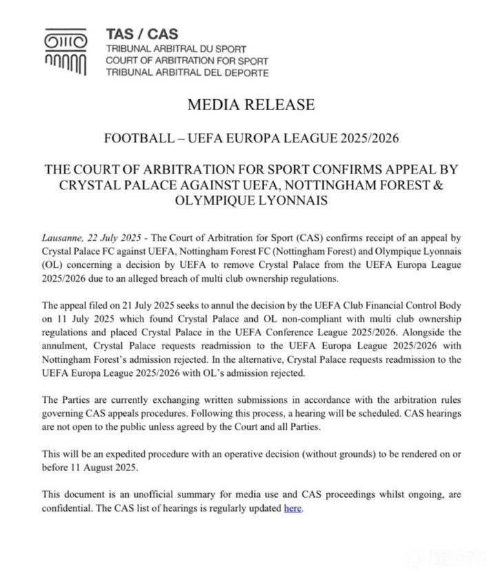 2025年7月22日,洛桑讯——体育仲裁法庭确认收到水晶宫足球俱乐部针对欧足联、诺丁汉森林足球俱乐部和里昂奥林匹克俱乐部的上诉。此次上诉涉及欧足联作出的一项决定,该决定因水晶宫涉嫌违反多俱乐部所有权规定,将其从2025/2026赛季欧足联欧洲联赛中移除。