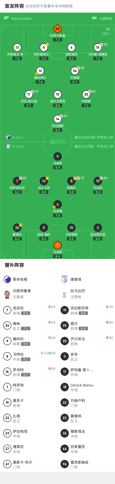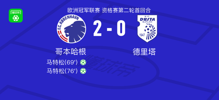 哥本哈根2-0德里塔,马特松独中两元战报bot @懂球帝2025-07-23 02:56欧洲冠军联赛资格赛第二轮首回合,哥本哈根对阵德里塔。比赛中,哥本哈根球员马特松两次主罚点球命中,为球队锁定胜局。最终比分定格在2-0,哥本哈根取得比赛胜利。点击查看本场比赛详细数据>>点击查看欧冠完整积分榜>>精彩瞬间第69分钟,哥本哈根球员马特松罚入点球。第76分钟,哥本哈根球员马特松罚入点球。 球队阵容 技术统计 展开更多