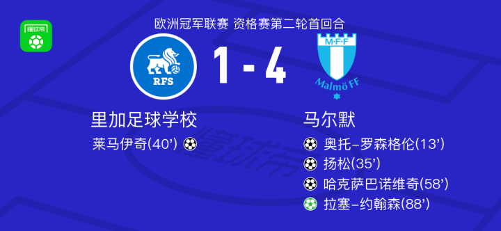 北京时间7月23日,欧洲冠军联赛资格赛第二轮首回合,里加足球学校迎战马尔默。比赛第13分钟,马尔默球员奥托-罗森格伦成功破门,为球队首开纪录。第35分钟,布萨内洛送出助攻,扬松破门扩大比分。第40分钟,萨瓦尔尼克斯为里加足球学校送出助攻,莱马伊奇破门帮助球队扳回一城。第58分钟,胡戈-博林送出助攻,哈克萨巴诺维奇破门得分。第88分钟,拉塞-约翰森主罚点球命中,进一步扩大比分。最终,里加足球学校以1比4不敌马尔默。