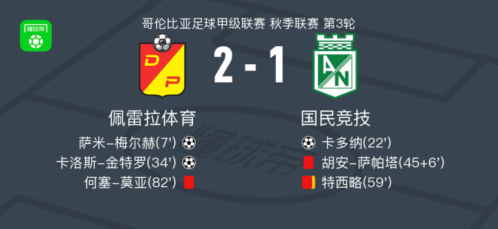 北京时间7月23日哥伦比亚足球甲级联赛 秋季联赛 第3轮,佩雷拉体育主场对阵国民竞技。佩雷拉体育萨米-梅尔赫破门,卡洛斯-金特罗破门。国民竞技卡多纳破门。最终比分佩雷拉体育 2-1 国民竞技。