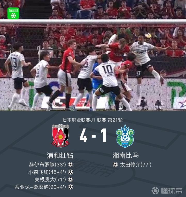 北京时间7月23日,日本职业联赛J1第21轮,浦和红钻坐镇主场迎战湘南比马。浦和红钻由赫伊布罗滕首开纪录,小森飞绚在上半场补时阶段扩大比分,关根贵大在下半场中段再下一城,蒂亚戈-桑塔纳在比赛尾声锦上添花。湘南比马由太田修介扳回一球。最终,浦和红钻以4比1战胜湘南比马。