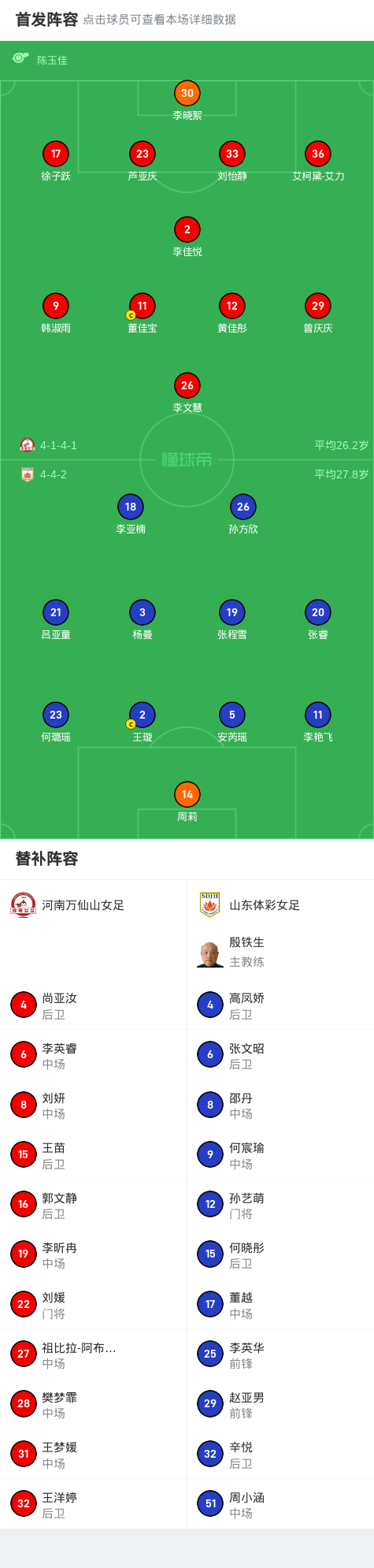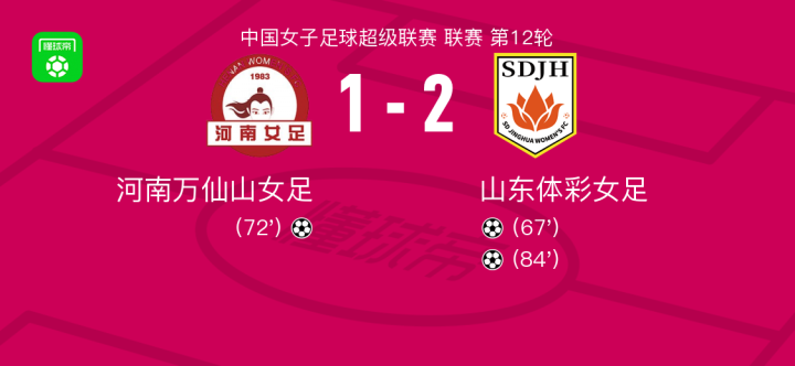 山东体彩女足2-1河南万仙山女足战报bot @懂球帝2025-07-23 21:24北京时间7月23日中国女子足球超级联赛 联赛 第12轮,河南万仙山女足主场对阵山东体彩女足。最终比分河南万仙山女足 1-2 山东体彩女足。点击查看本场比赛详细数据>>点击查看中女超完整积分榜>>精彩瞬间第67分钟,山东体彩女足球员打入一球。第72分钟,河南万仙山女足球员打入一球。第84分钟,山东体彩女足球员打入一球。 球队阵容 技术统计 展开更多