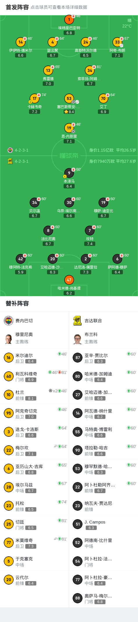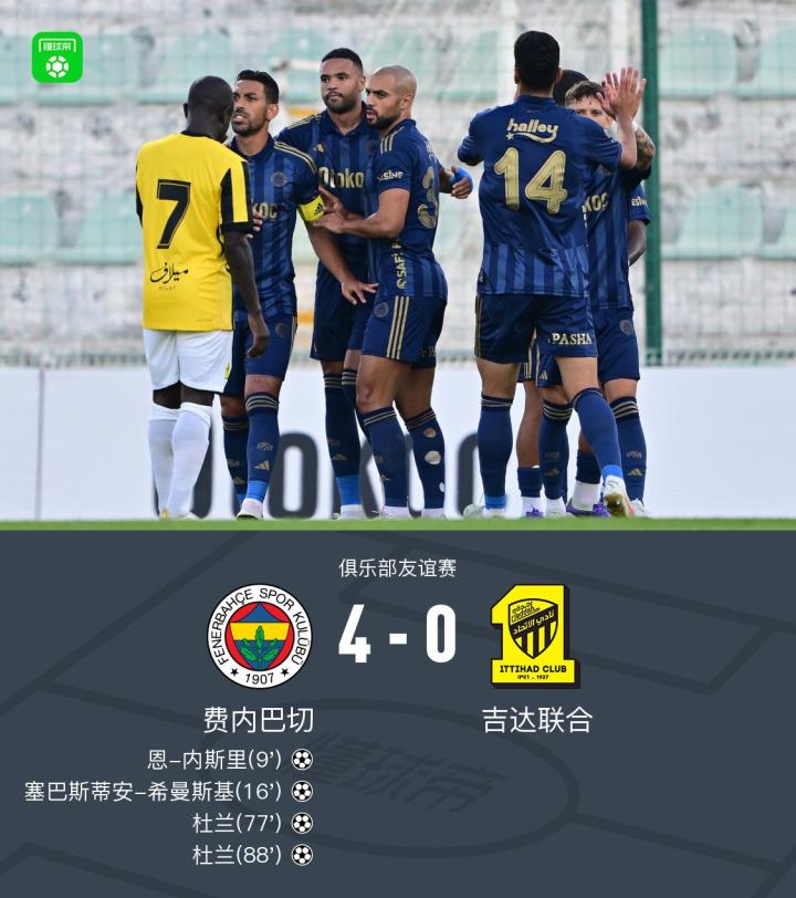 费内巴切4-0大胜吉达联合,恩-内斯里破门,杜兰双响
