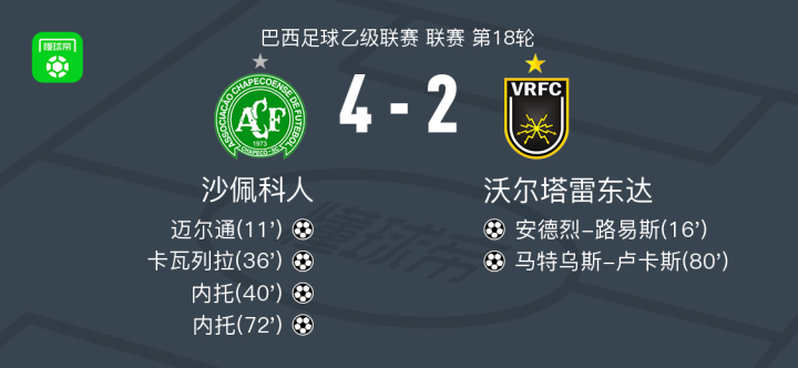 北京时间7月24日,巴西足球乙级联赛第18轮,沙佩科人在主场迎战沃尔塔雷东达。比赛中,沙佩科人由迈尔通首开纪录,随后卡瓦列拉在乔瓦尼-奥古斯托的助攻下扩大比分。内托则在上下半场各入一球,完成梅开二度。沃尔塔雷东达方面,安德烈-路易斯在一次进攻中破门得分,马特乌斯-卢卡斯也在比赛后期攻入一球。最终,沙佩科人以4比2战胜沃尔塔雷东达。
