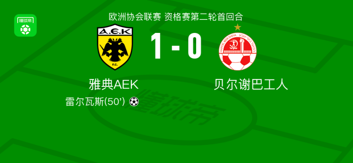 北京时间7月25日欧洲协会联赛 资格赛第二轮首回合,雅典AEK对阵贝尔谢巴工人。雅典AEK雷尔瓦斯破门。最终比分雅典AEK 1-0 贝尔谢巴工人。