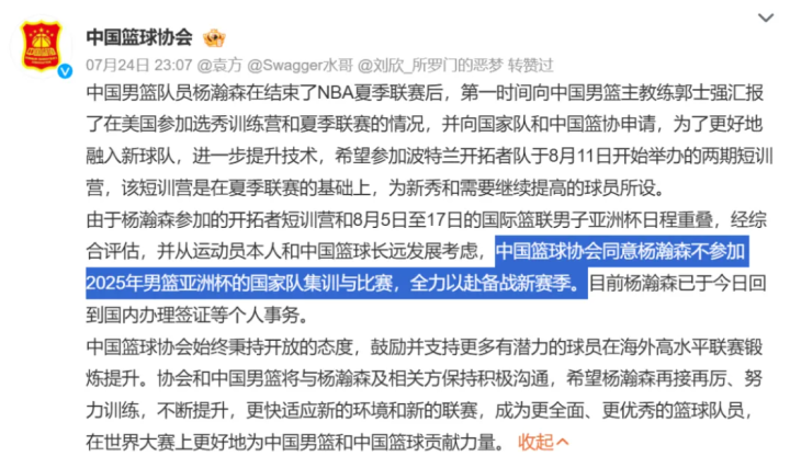 但是在昨天下午,中国篮协最终做出了决定:同意杨瀚森不参加中国男篮今夏的集训和比赛,可以在8月中旬前往波特兰,安心参加开拓者队准备的小型训练营,为新赛季的NBA常规赛做好准备。