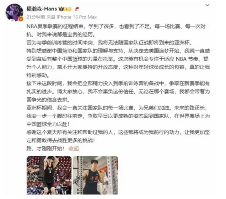 杨瀚森也是公开表态,感谢了中国篮协和一系列的支持,并且表示自己会努力提高,更好地回馈中国篮球。既然事情已经确定了,那就恭喜杨瀚森,希望杨瀚森能够好好努力,在NBA站稳脚跟。