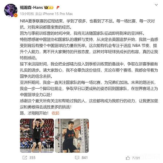 图说:杨瀚森微博官宣不参加亚洲杯的决定,这件事篮协和球员都处理得公开坦诚。