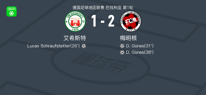 北京时间7月26日德国足球地区联赛巴伐利亚赛区第1轮,艾希斯特主场迎战梅明根。比赛中,艾希斯特球员Lucas Schraufstetter率先打破僵局,为主队取得领先。随后,梅明根球员D. Günes连入两球,帮助球队实现逆转。最终,艾希斯特以1比2不敌梅明根。
