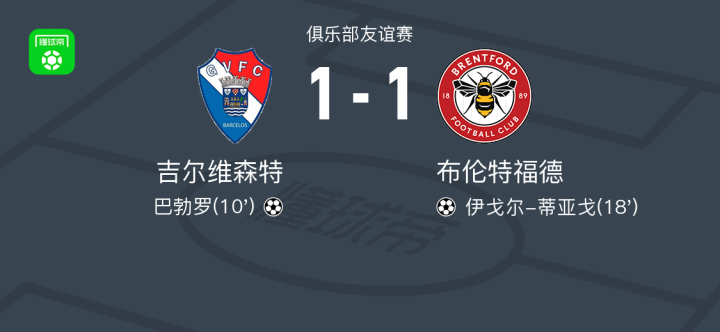 北京时间7月26日进行的一场俱乐部友谊赛中,吉尔维森特与布伦特福德展开较量。比赛中,吉尔维森特球员巴勃罗率先打破僵局,为球队取得领先。随后,布伦特福德球员伊戈尔-蒂亚戈成功扳平比分。最终双方以1比1握手言和。