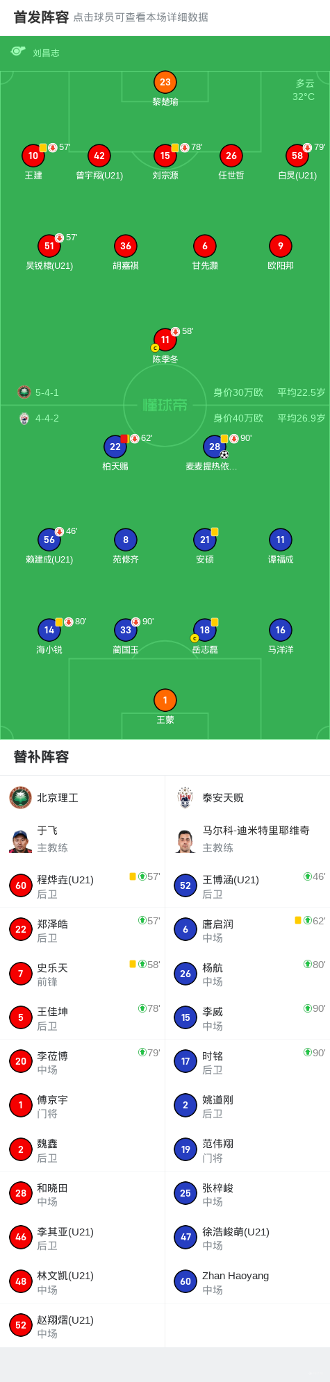 北京时间7月26日中国足球乙级联赛预赛阶段第21轮,北京理工主场迎战泰安天贶。比赛中,泰安天贶球员麦麦提热依木-麦麦提艾力成功打入全场唯一进球。比赛尾声阶段,泰安天贶球员柏天赐因累计两张黄牌被罚下场。最终,北京理工以0-1不敌泰安天贶。