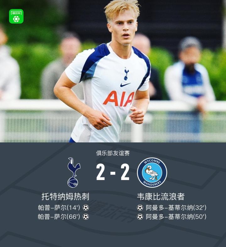 北京时间7月26日,俱乐部友谊赛,托特纳姆热刺对阵韦康比流浪者。比赛中,帕普-萨尔与基蒂尔纳分别上演梅开二度,奥斯汀扑救失误送礼。最终,热刺 2-2 韦康比流浪者。