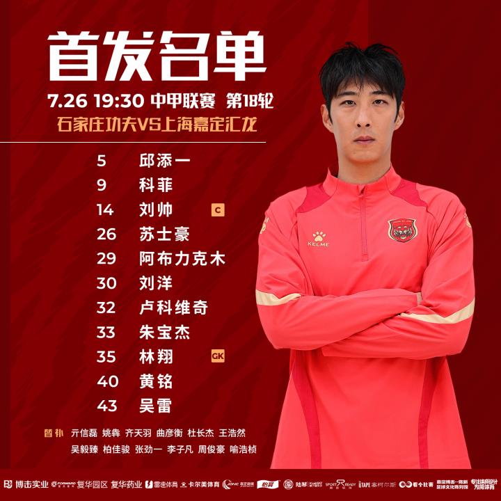 首发:5-邱添一,9-科菲,14-刘帅,26-苏士豪,29-阿布力克木,30-刘洋,32-卢科维奇,33-朱宝杰,35-林翔(GK),40-黄铭(U21),43-吴雷
