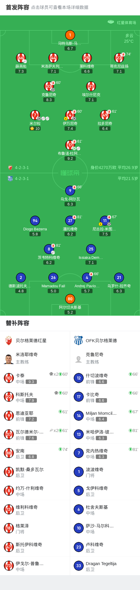 贝尔格莱德红星7-1狂胜OFK贝尔格莱德,卡泰梅开二度,科斯托夫破门