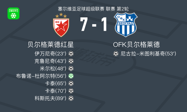 北京时间7月27日塞尔维亚足球超级联赛 联赛 第2轮,贝尔格莱德红星主场对阵OFK贝尔格莱德。贝尔格莱德红星伊万尼奇破门,克鲁尼奇破门,米尔松破门,卡泰梅开二度,科斯托夫破门,布鲁诺-杜阿尔特破门。OFK贝尔格莱德尼古拉-米图利基奇破门。最终比分贝尔格莱德红星 7-1 OFK贝尔格莱德。