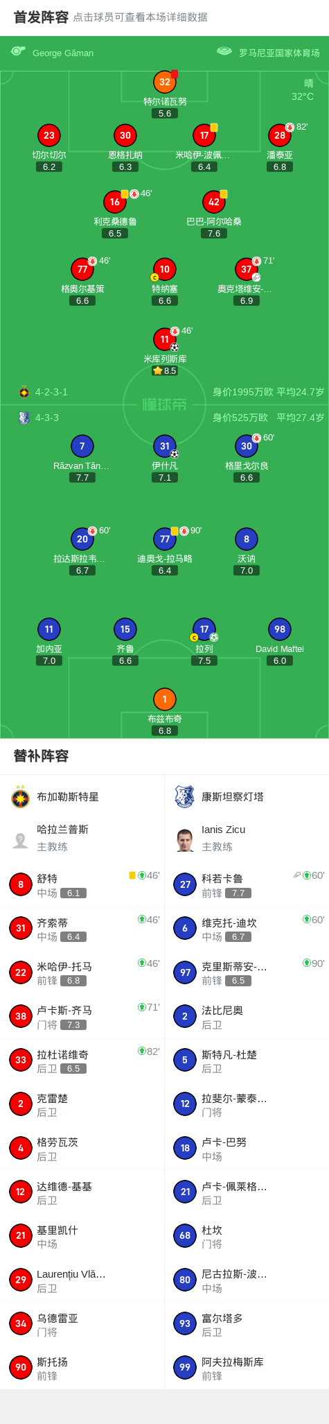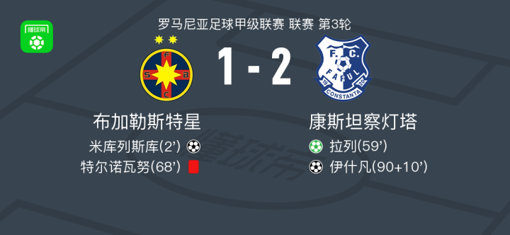 北京时间7月27日罗马尼亚足球甲级联赛 联赛 第3轮,布加勒斯特星主场对阵康斯坦察灯塔。布加勒斯特星米库列斯库破门。康斯坦察灯塔拉列破门,伊什凡破门。最终比分布加勒斯特星 1-2 康斯坦察灯塔。