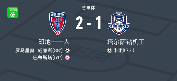 北京时间7月27日美甲杯,印地十一人对阵塔尔萨钻机工。印地十一人罗马里奥-威廉斯破门。塔尔萨钻机工科利破门,巴蒂斯塔自摆乌龙。最终比分印地十一人 2-1 塔尔萨钻机工。