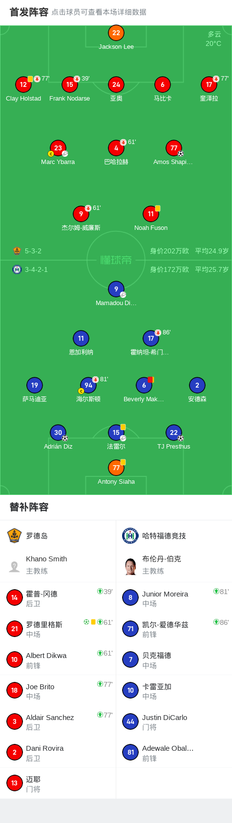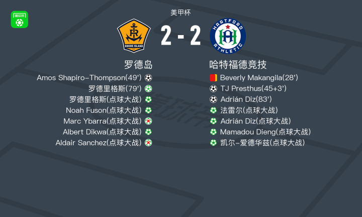 北京时间7月27日美甲杯,罗德岛对阵哈特福德竞技。罗德岛Amos Shapiro-Thompson破门,罗德里格斯破门。哈特福德竞技TJ Presthus破门,Adrián Diz破门。最终比分罗德岛 2-2 哈特福德竞技。