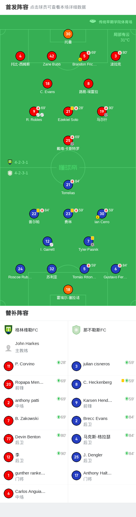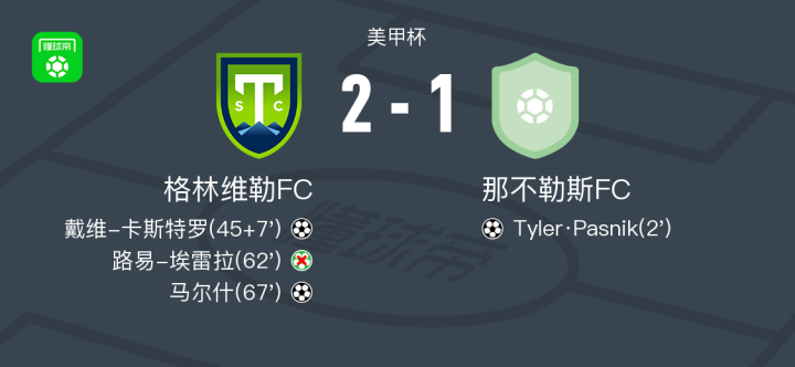 北京时间7月27日美甲杯,格林维勒FC与那不勒斯FC展开对决。比赛开始后,那不勒斯FC由I. Garrett助攻Tyler·Pasnik率先破门。上半场补时阶段,格林维勒FC由R. Robles助攻戴维-卡斯特罗扳平比分。下半场,格林维勒FC获得点球机会,但由路易-埃雷拉主罚时未能命中。随后,R. Robles再次送出助攻,帮助马尔什完成反超进球。最终,格林维勒FC以2-1战胜那不勒斯FC。