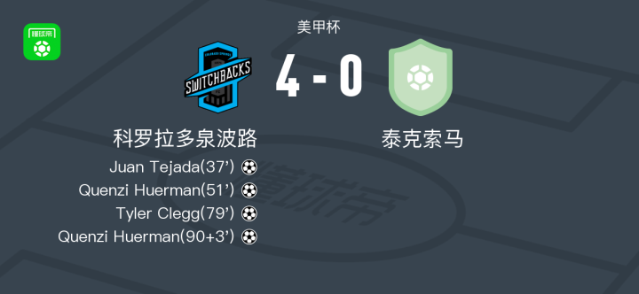 科罗拉多泉波路4-0大胜泰克索马,Quenzi Huerman梅开二度,Tyler Clegg破门
