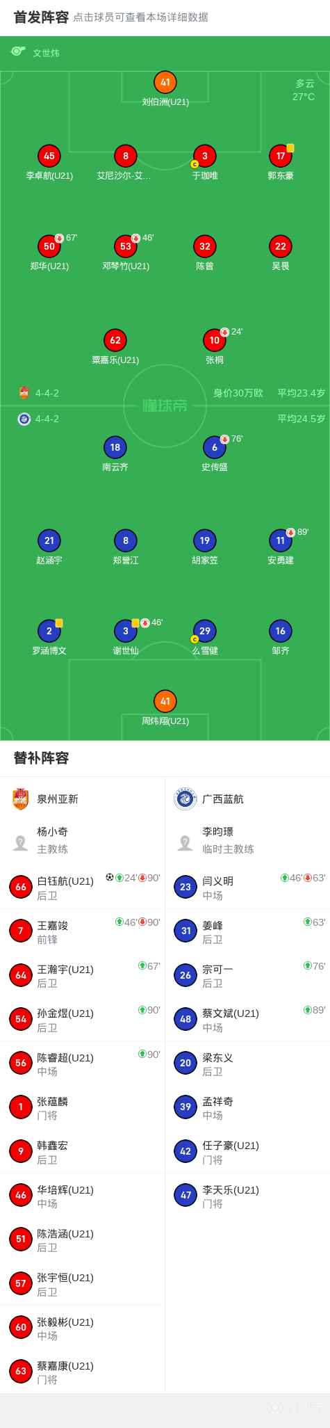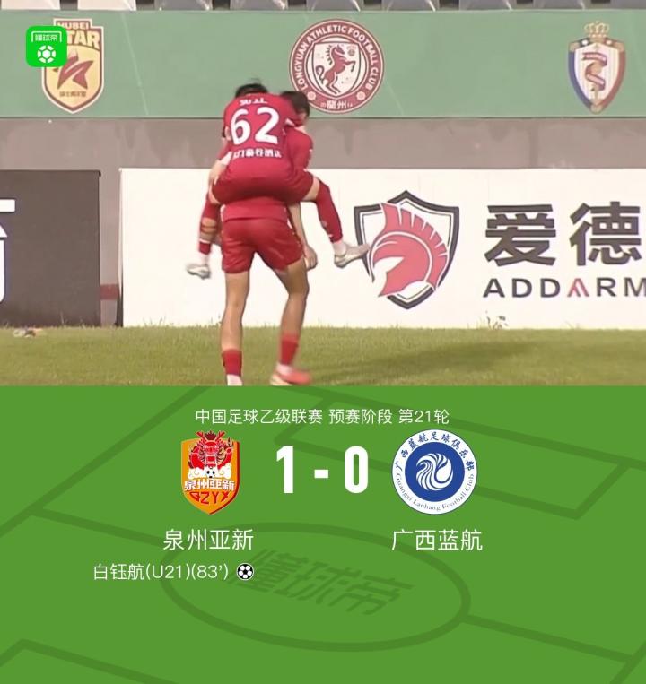 泉州亚新1-0广西蓝航,白钰航制胜战报bot @懂球帝2025-07-27 18:217月27日,中国足球乙级联赛预赛阶段第21轮,泉州亚新坐镇主场迎战广西蓝航。比赛中,泉州亚新球员白钰航攻入全场唯一进球。最终,泉州亚新以1比0战胜广西蓝航,全取三分。点击查看本场比赛详细数据>>点击查看中乙完整积分榜>>精彩瞬间第83分钟,泉州亚新球员白钰航打入一球。球队阵容展开更多