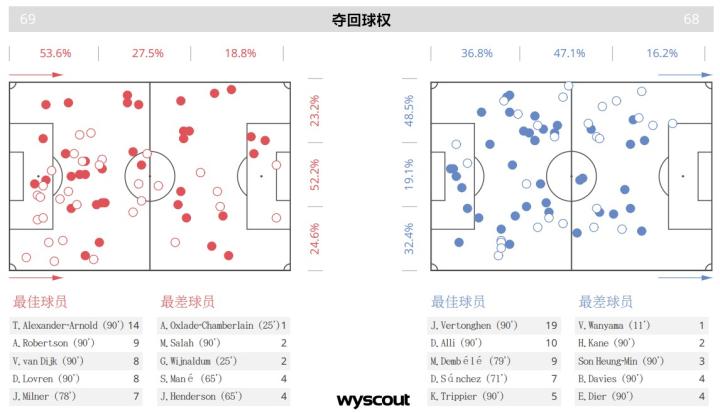 前10分钟,热刺6次丢掉球权比利物浦多出了3次,更重要的是其中的一半都发生在了本方半场。也不能全怪防线天团,毕竟利物浦每次面对强队的开局都是鸡血式高压逼抢。前20分钟,双方同样进行了8次抢断并且5次成功,但利物浦其中的3次发生在了对方半场,热刺却全都发生在自己球门的30米范围之内。