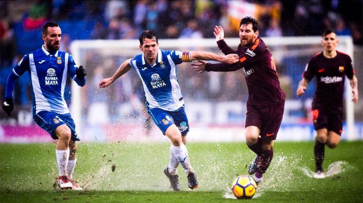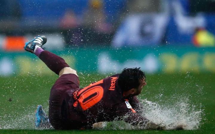 首先,这是一场不折不扣的“水战”。越来越瓢泼的大雨加上埃尔普拉特球场糟糕的排水系统,使得本场比赛的下半时逐渐超出了传统雨战的概念。大量的积水造成了地面传递严重受阻,力度和准度都难以把握,甚至布斯克茨和后防线之间一度出现了“隔沟相望”的景象。