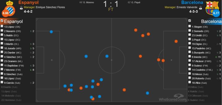 于是,我们看到了赛后这样的一组数据:12次射门只比对手多了5次,全场只有4次通过短传形成了射门机会,巴萨全队的13次成功过人更是只比西班牙人多了1次而已。