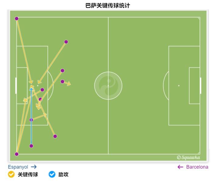 1-1战平西班牙人的比赛中,巴萨全队有过11次带来射门的关键传球,其中包括梅西利用任意球为皮克送上的助攻。不过在这11次里只有4次来自于短传,其他都是传中,这对于巴萨来说已经相当少见。